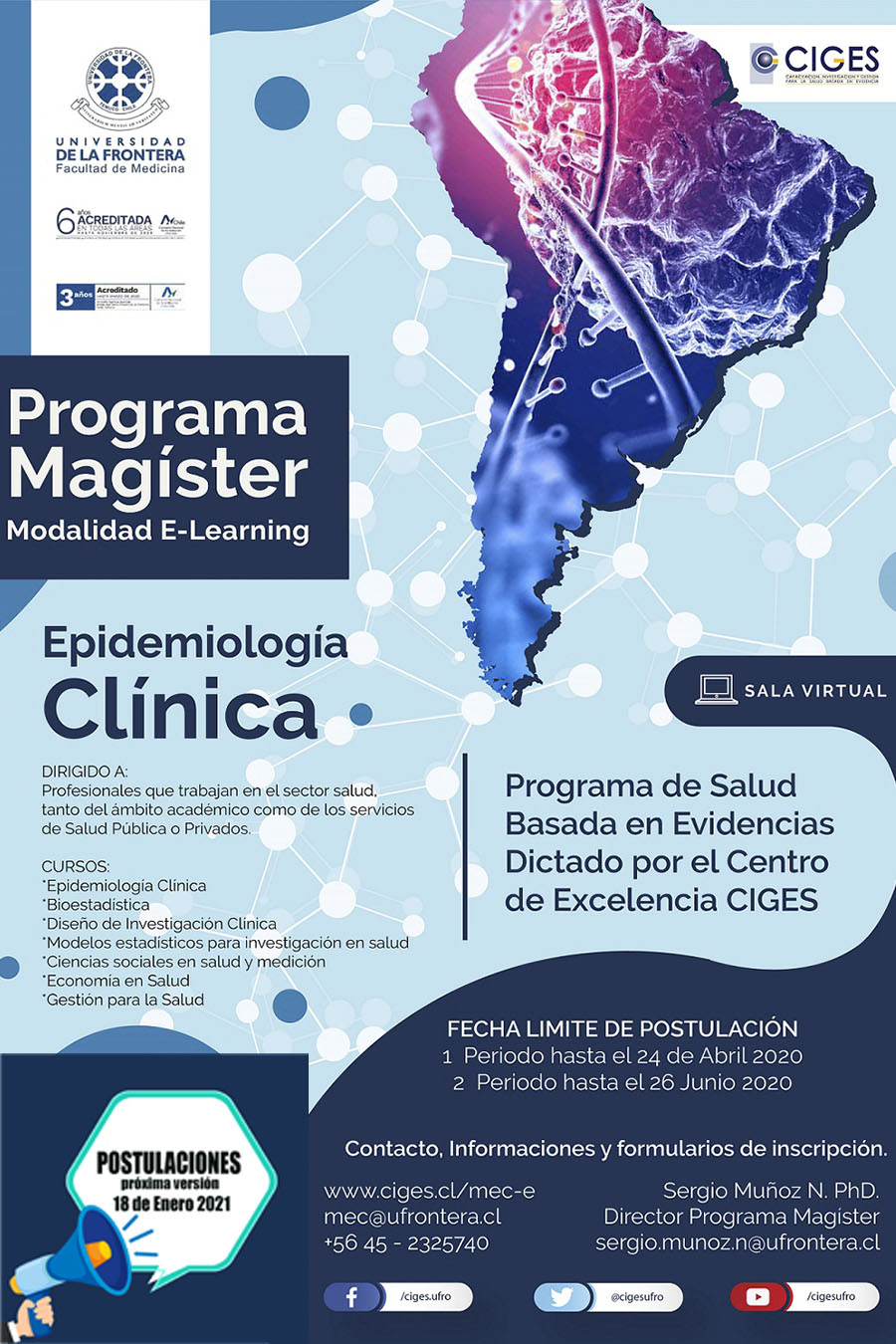 El Programa de Magíster en Epidemiología Clínica tiene como objetivo formar un graduado con conocimientos y habilidades en planificación, ejecución y análisis de investigación en aspectos de salud, incluyendo consideraciones económicas y de gestión, incorporando metodología de las ciencias sociales y uso de estadísticas oficiales en la planificación y provisión de servicios de salud.